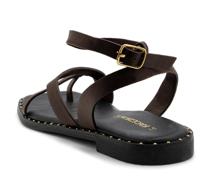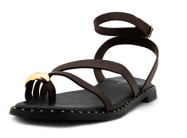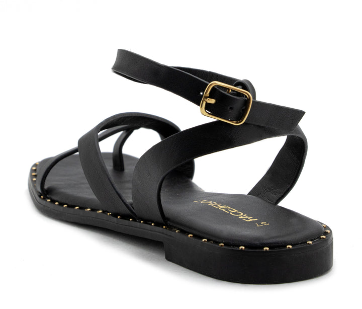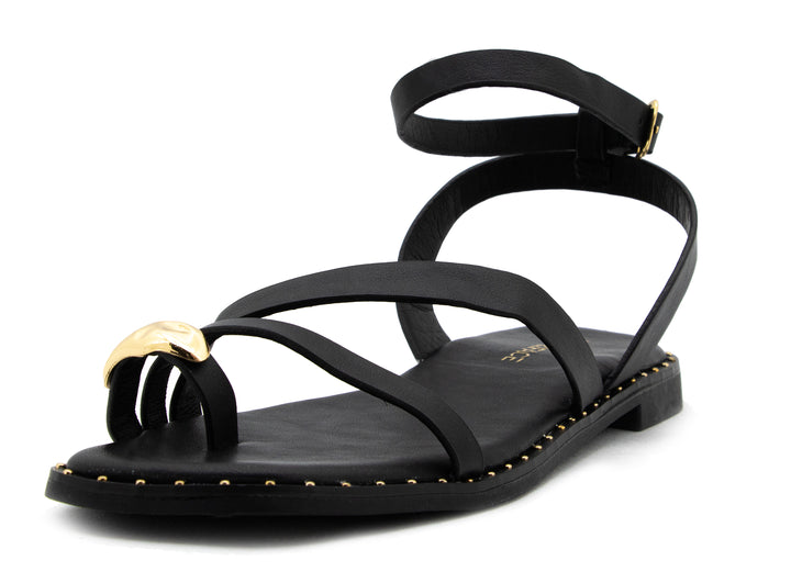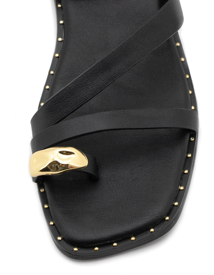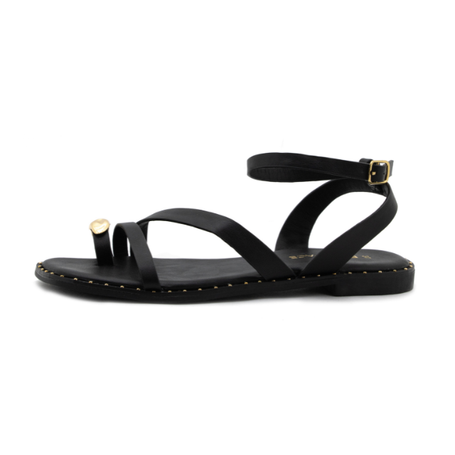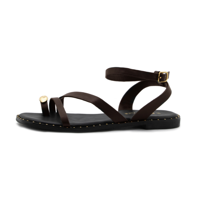 Eleva tus looks casuales con esta sandalia plana, diseñada con tiras finas cruzadas y un elegante detalle dorado al frente. Su plantilla acolchada brinda comodidad durante todo el día, mientras que las aplicaciones metálicas en la suela añaden un toque moderno y sofisticado. Ideal para combinar con vestidos, faldas o jeans en tus días de verano o escapadas urbanas.