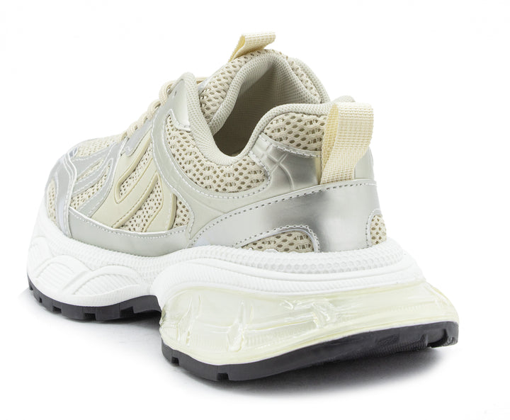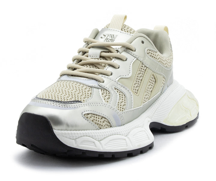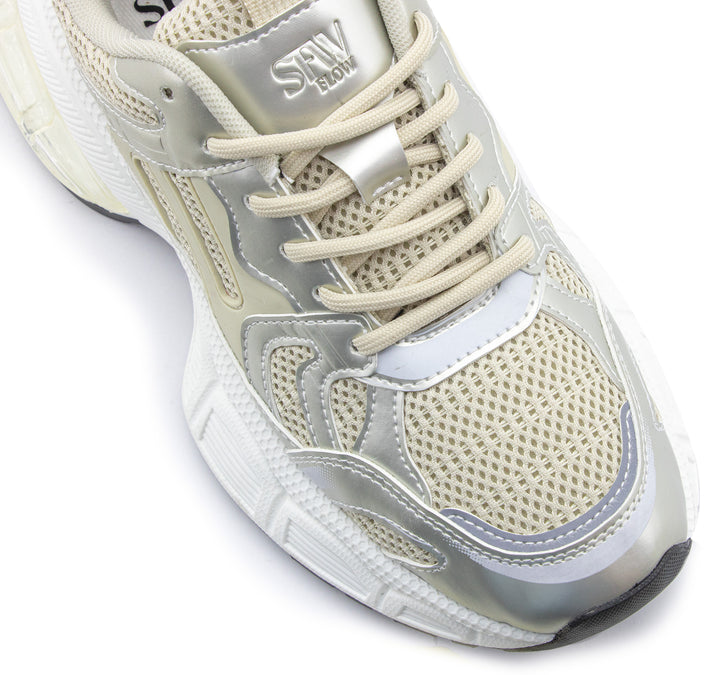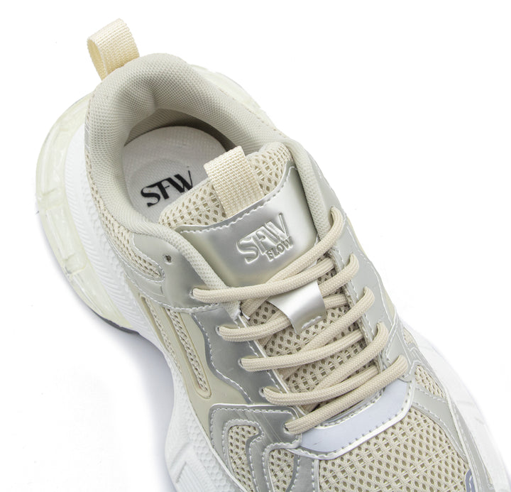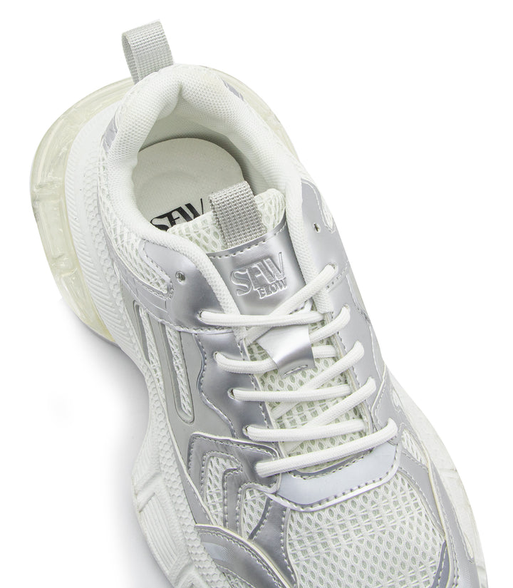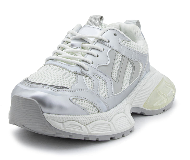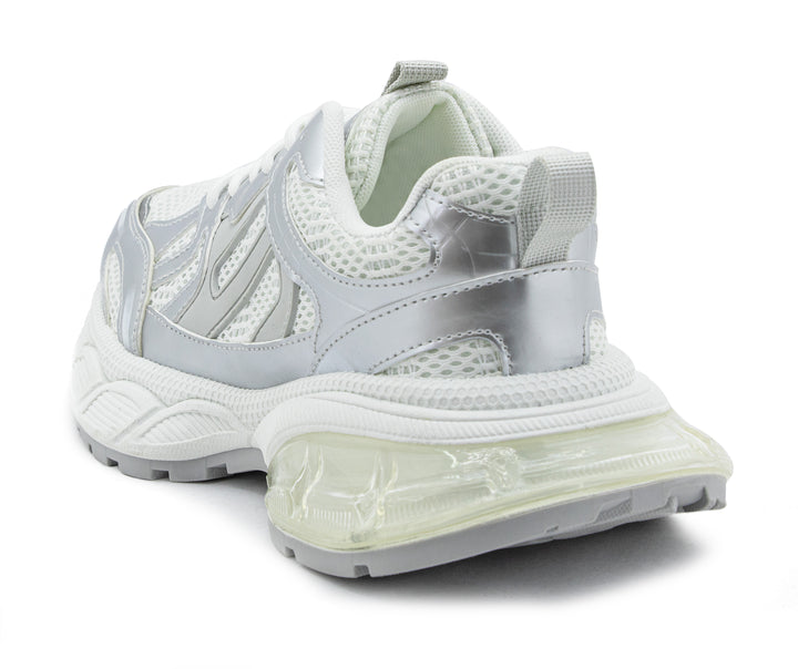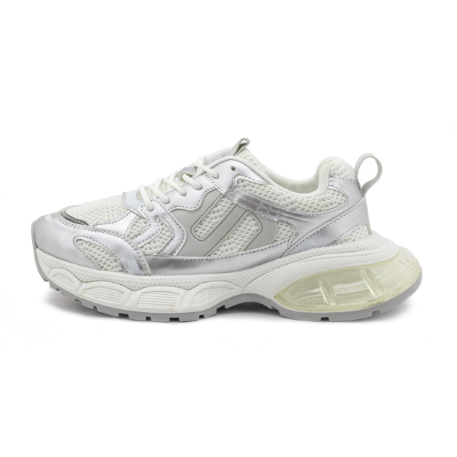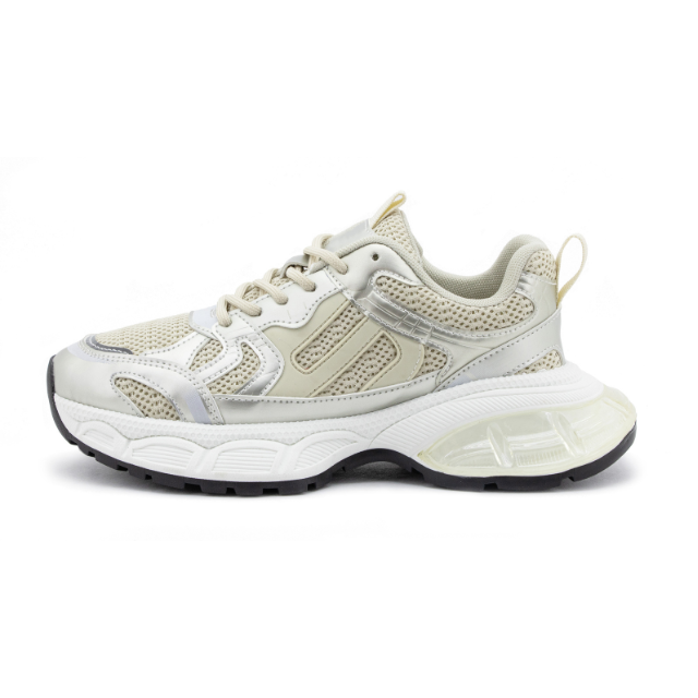 Eleva tu look deportivo con este tenis blanco con acabados plateados y diseño robusto. Su estructura combina malla transpirable y refuerzos sintéticos para mayor durabilidad, mientras que la suela gruesa ofrece excelente amortiguación y estabilidad en cada paso. Ideal para entrenamientos, caminatas o para un outfit urbano con un toque moderno. ¡Comodidad y estilo en un solo calzado!