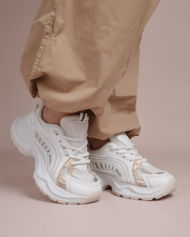 Luce moderna y cómoda con estos tenis de mujer en color blanco, diseñados para destacar en cada paso. Su suela texturizada de gran volumen proporciona excelente amortiguación y un look vanguardista, ideal para outfits urbanos y deportivos. Incorporan detalles en beige y gris que aportan dinamismo al diseño, además de paneles en malla que ofrecen frescura durante todo el día. Perfectos para combinar con jeans, leggings o conjuntos athleisure.